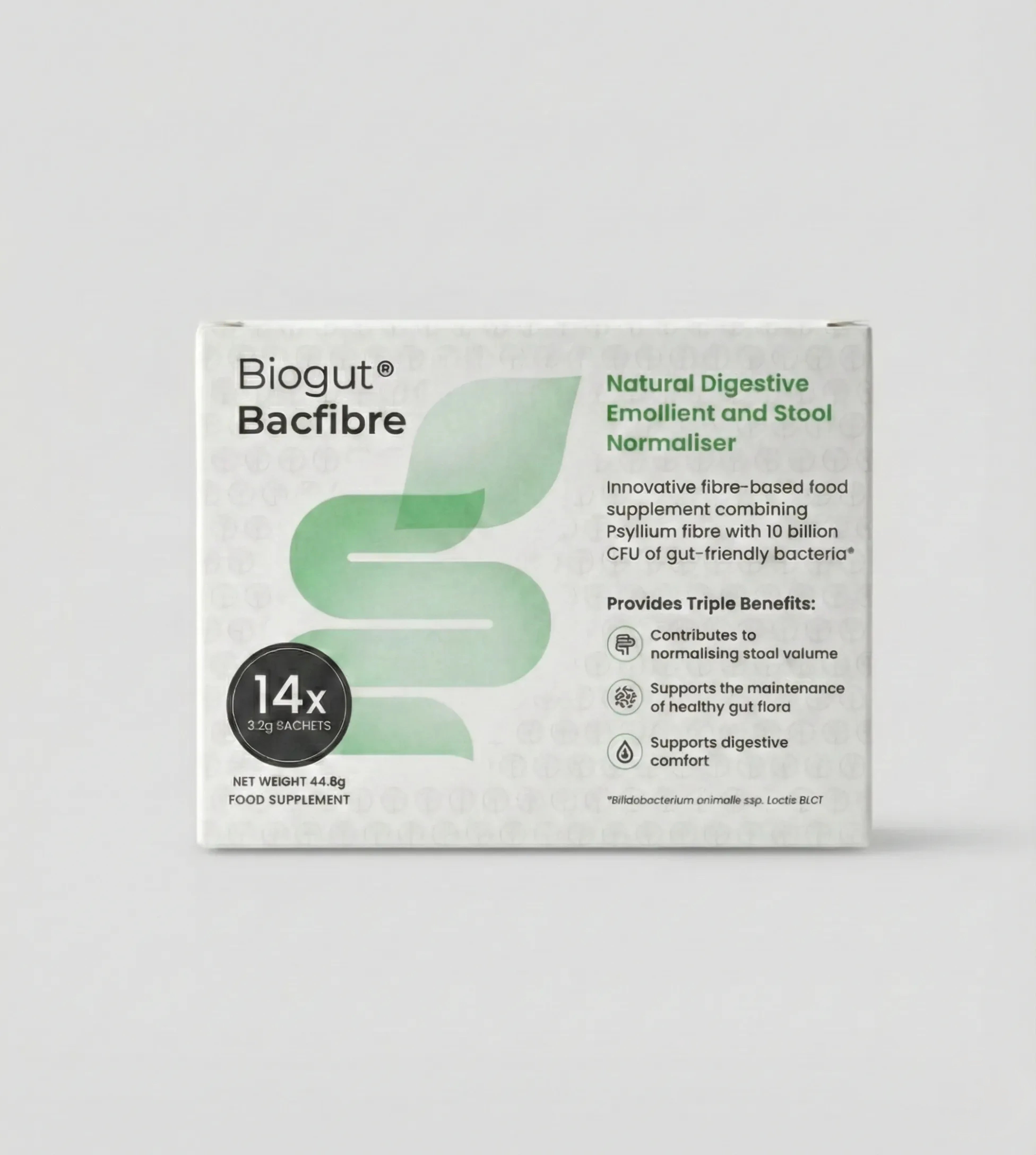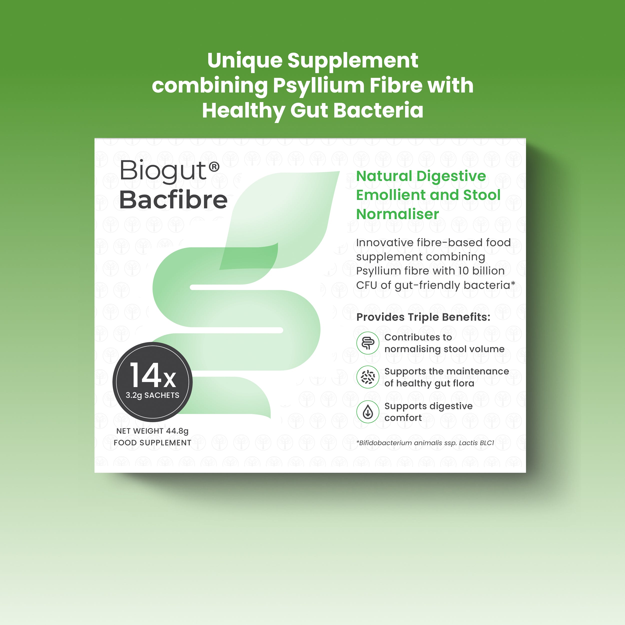 Biogut Bacfibre is UK’s 1st fibre-based food supplement combining Psyllium with 10 billion CFU of Bifidobacterium animalis ssp. Lactis BLC1. This unique formulation offers a range of digestive benefits, including promoting regular bowel movements, enhancing digestive comfort, normalising stool consistency, and improving nutrient absorption.