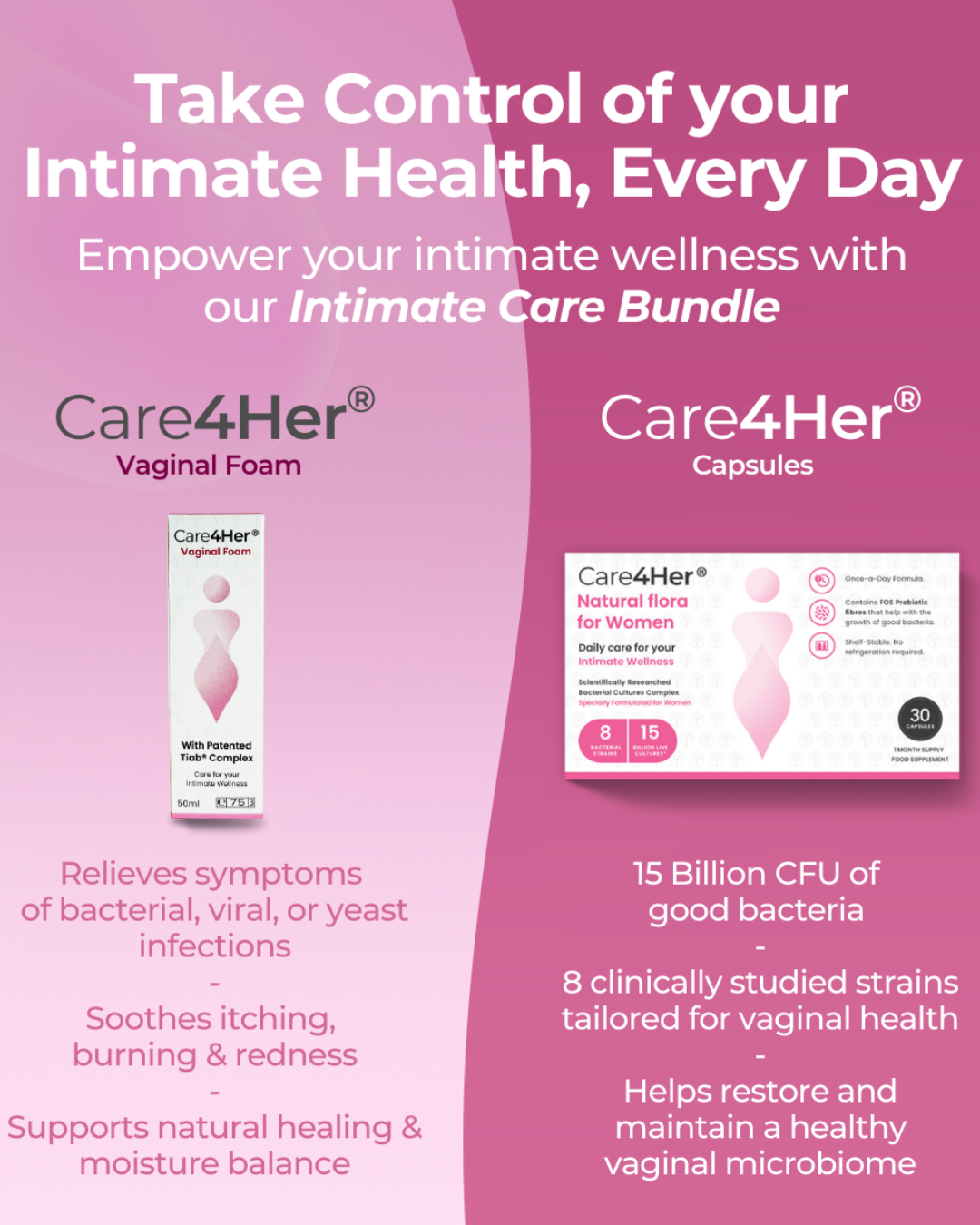 CARE4HER Natural Flora Capsules deliver 15 billion live cultures from 8 strains studied specifically for vaginal health — helping prevent recurring infections, odour, and imbalances.