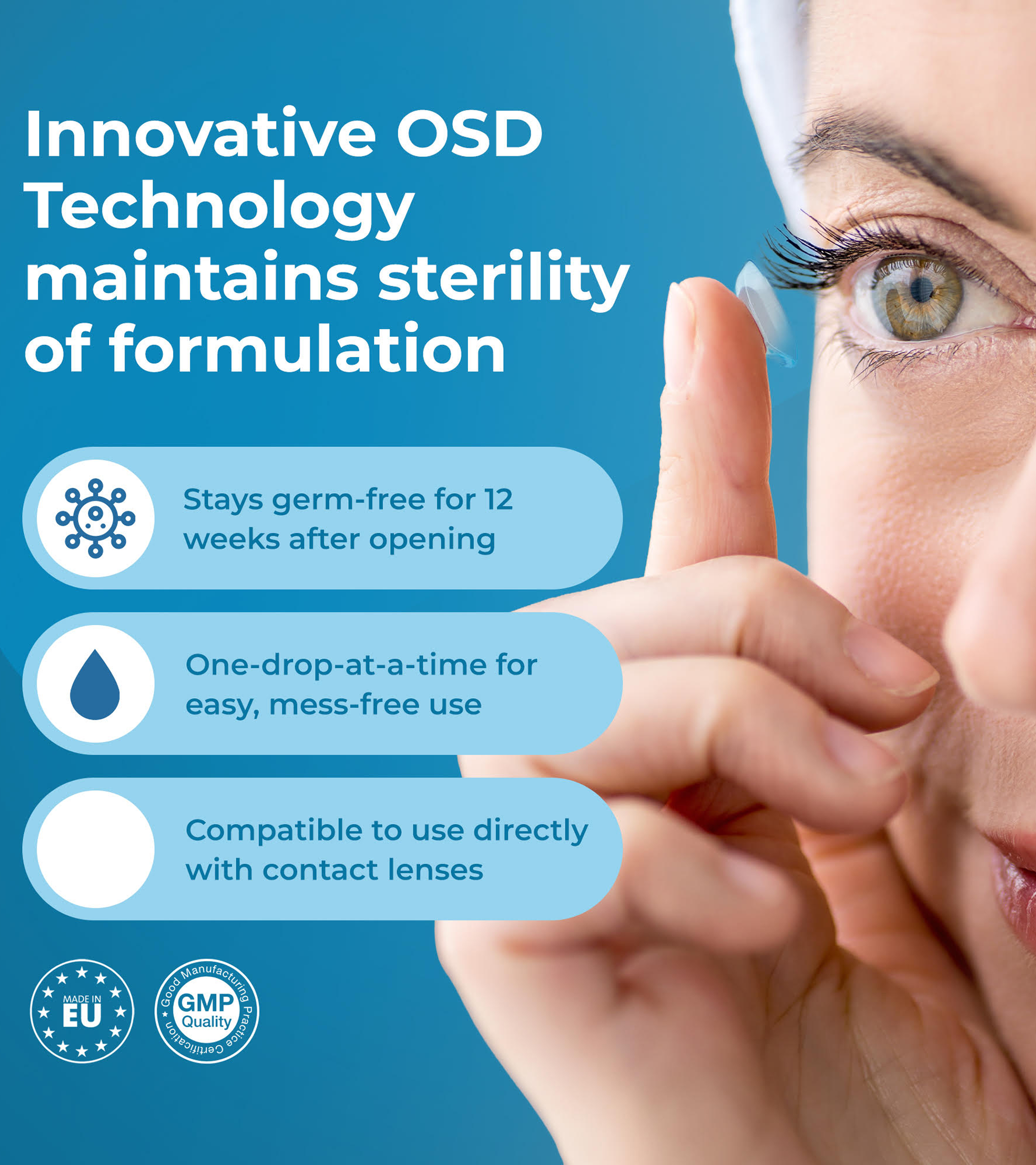 Unique OSD technology keeps contents germ-free for 12 weeks after opening. One-drop-at-a-time delivery ensures easy, mess-free use. Ideal for daily and on-the-go eye hydration. Made in the EU & CE Certified – Manufactured to the highest safety and quality standards, ensuring safe, trusted and effective eye care