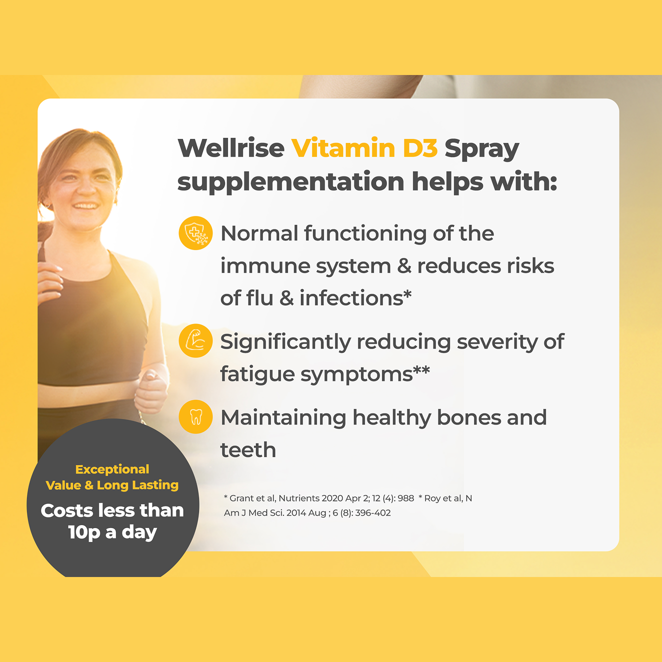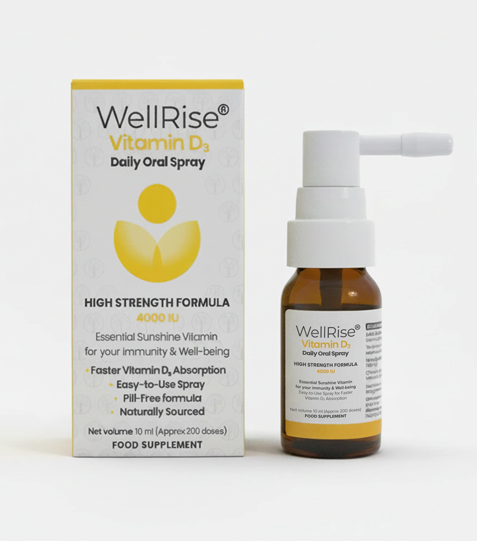 Your daily dose of the sunshine vitamin – WellRise Vitamin D3 4000 IU Oral Spray is a fast-acting, pill-free formula to support your health all year round. Formulated with MicrofineSpray technology, precision-nozzle and MCT oil for faster absorption, this Vitamin D3 spray delivers your essential Vitamin D3 dose faster and more effectively compared to conventional better tablets or capsules. Each spray contains 4000 IU (100 µg) of Vitamin D3, the maximum daily limit recommended by UK NHS.