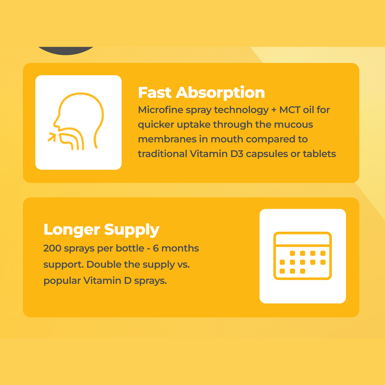 Microfine spray technology ensures faster absorption. Precision nozzle targets Vitamin D3 delivery to right areas in the mouth for maximum effectiveness.
